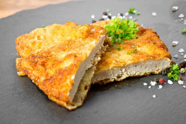 Boneless and skinless chicken breast with Italian breadcrumbs, pan fried in a light butter and olive oil blend.